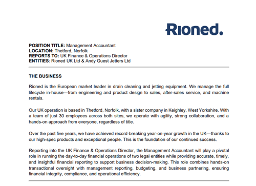 Pure are delighted to be working with Rioned to appoint a new Management Accountant.